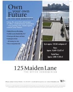 Time Equities introduced one of the first In Lower Manhattan, the 17-story 125 Maiden Lane. The 350,000-square-foot building had 180,000 square feet available for sale starting in the summer of 2006.